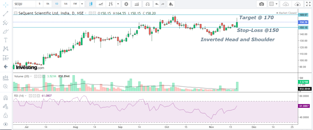 Inverted Head and Shoulder found on the chart on daily basis. Price has given positive breakout on the weekly candle, this chart expecting positive movement in short -term. The breakout point is 156 buy above 158 and keeps the stop loss on 150, for the target 170 for short-term and 186 medium-term.